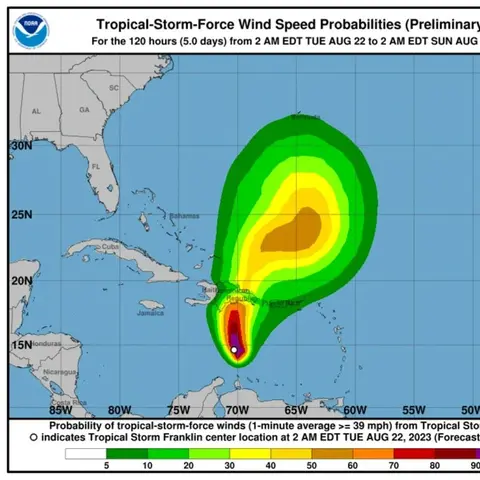 SANTO DOMINGO.-  Por el momento una vaguada a nivel alto sigue bloqueando el movimiento de Franklin, sin embargo, esta vaguada ha iniciado lentamente a moverse hacia el oeste/noroeste, ubicándose sobre el canal de Los Vientos, y a medida que siga alejándose del área, es probable que entre la tarde y la noche de hoy, Franklin acelere un poco más hacia el noroeste, informó la Oficina Nacional de Meteorología.