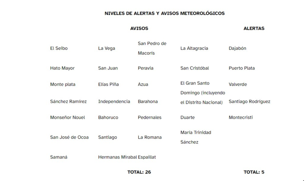La ONAMET debido a las lluvias ocurridas y las que se esperan en los próximos días, modifica los niveles de avisos y alertas meteorológica, ante posibles crecidas repentinas de ríos, arroyos y cañadas, generadores de inundaciones urbanas y/o rurales, así como, deslizamientos de tierra.
