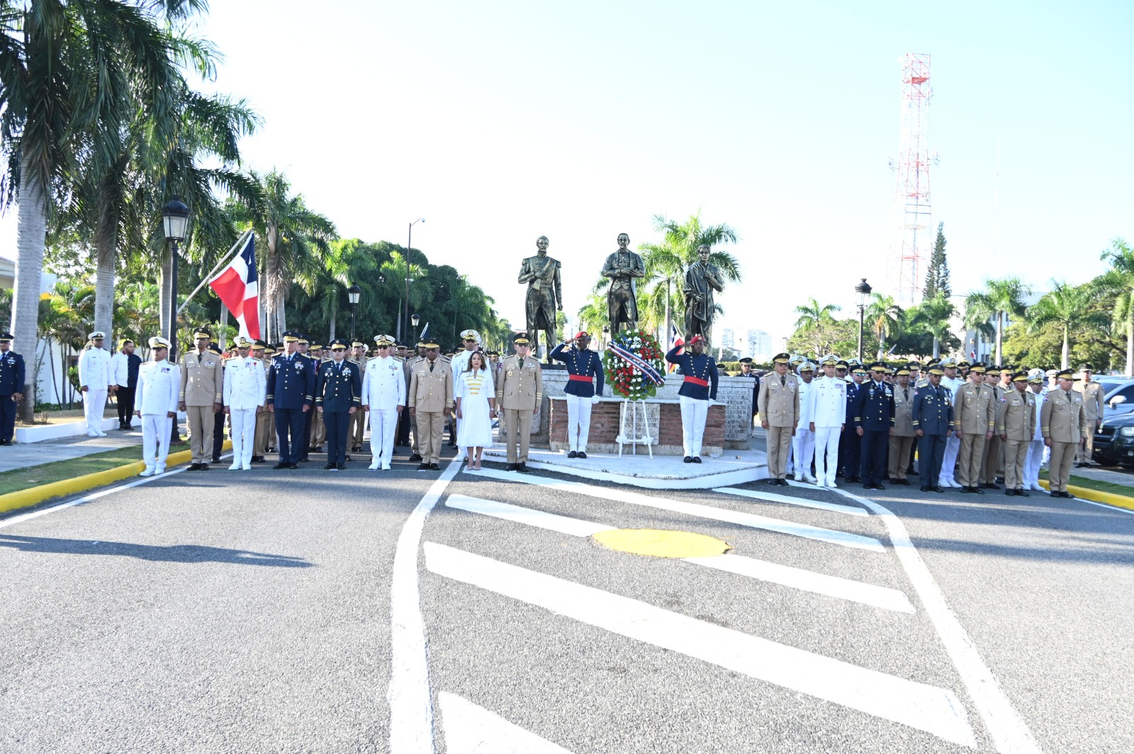 Acto seguido, quienes participaron de la izada de bandera, procedieron a depositar una ofrenda floral en la estatua de los Padres de la Patria, ubicada en la puerta principal de entrada del recinto militar que aloja la sede del MIDE, que lleva el nombre del Patricio Ramón Matías Mella.