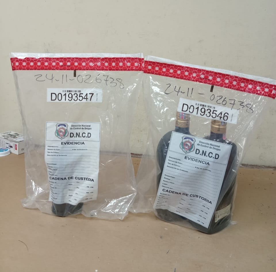Por instrucciones del fiscal actuante, se procedió a abrir el equipaje, encontrando en su interior tres botellas llenas de un líquido, que tras ser analizado, resultó positivo a cocaína líquida, según el análisis del Instituto Nacional de Ciencias Forenses (INACIF).