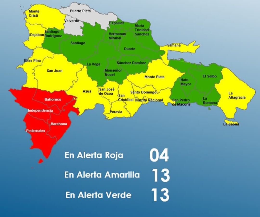 En alerta amarilla están: San José de Ocoa, Samaná, Dajabón, Azua, Monte Plata, Elías Piña, Peravia, La Altagracia, San Juan, Monte Cristi, Santo Domingo, San Cristóbal y Distrito Nacional.