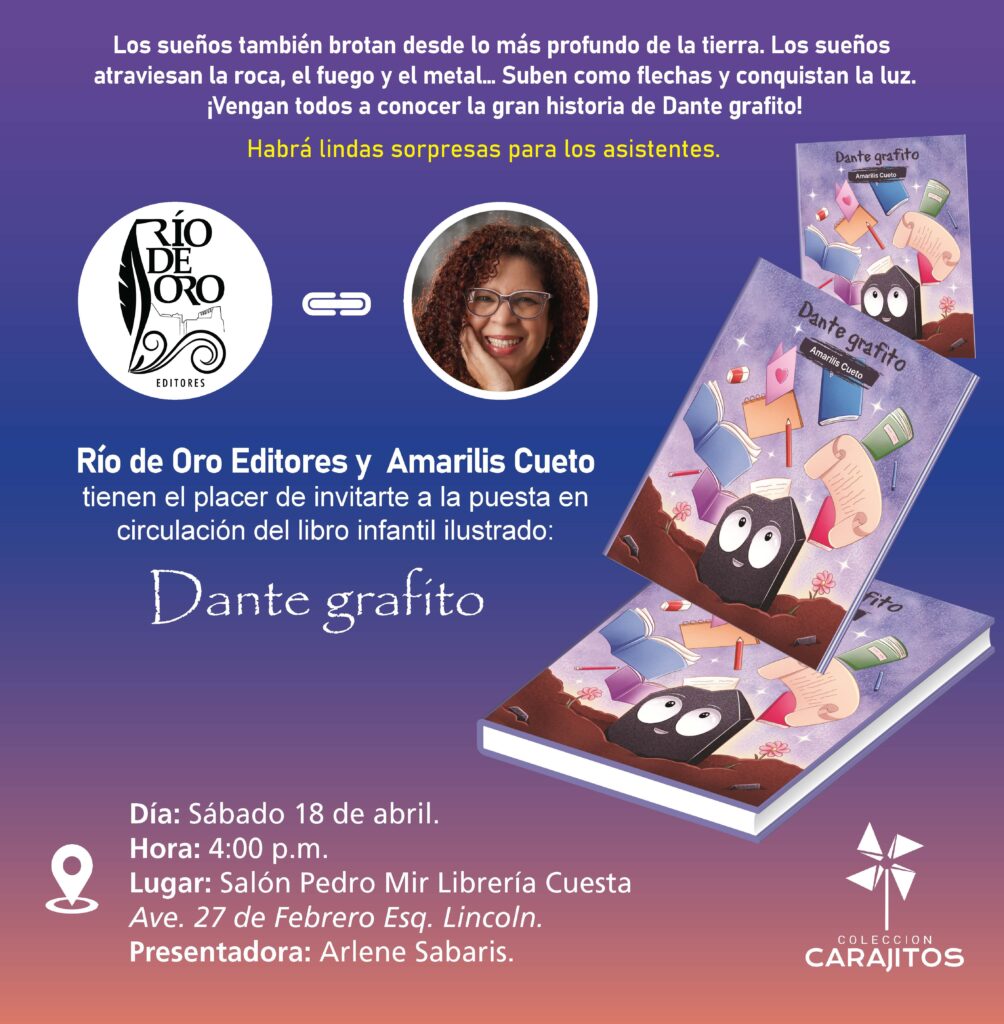 Santo Domingo.– Este sábado 18 de abril, a las 4:00 de la tarde, será puesto en circulación el libro infantil ilustrado Dante grafito, de la autora dominicana Amarilis Cueto, en el Salón Pedro Mir de Librería Cuesta (Ave. 27 de Febrero esq. Lincoln). La presentación estará a cargo de la escritora Arlene Sabaris, en un encuentro que reunirá a destacadas personalidades del ámbito literario, especialmente vinculadas a la literatura infantil y juvenil.